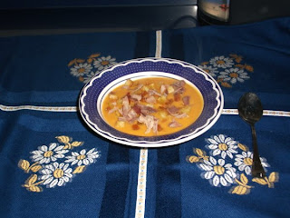 Picar toda la verdura y rehogar en un poquito de aceite de oliva. Pelar y cortar a dados la calabaza, patatas y zanahoria y añadir a la verdura . Sofreir durante unos minutos.Salpimentar a gusto y cubrir de agua. Cocer a fuego suave hasta que esté todo tierno. Pasar por la batidora y si se desea una crema más suave, después por el chino. Poner la crema en cuencos y decorar con pan frito. En el momento de servir se añade jamón picadito y frito.