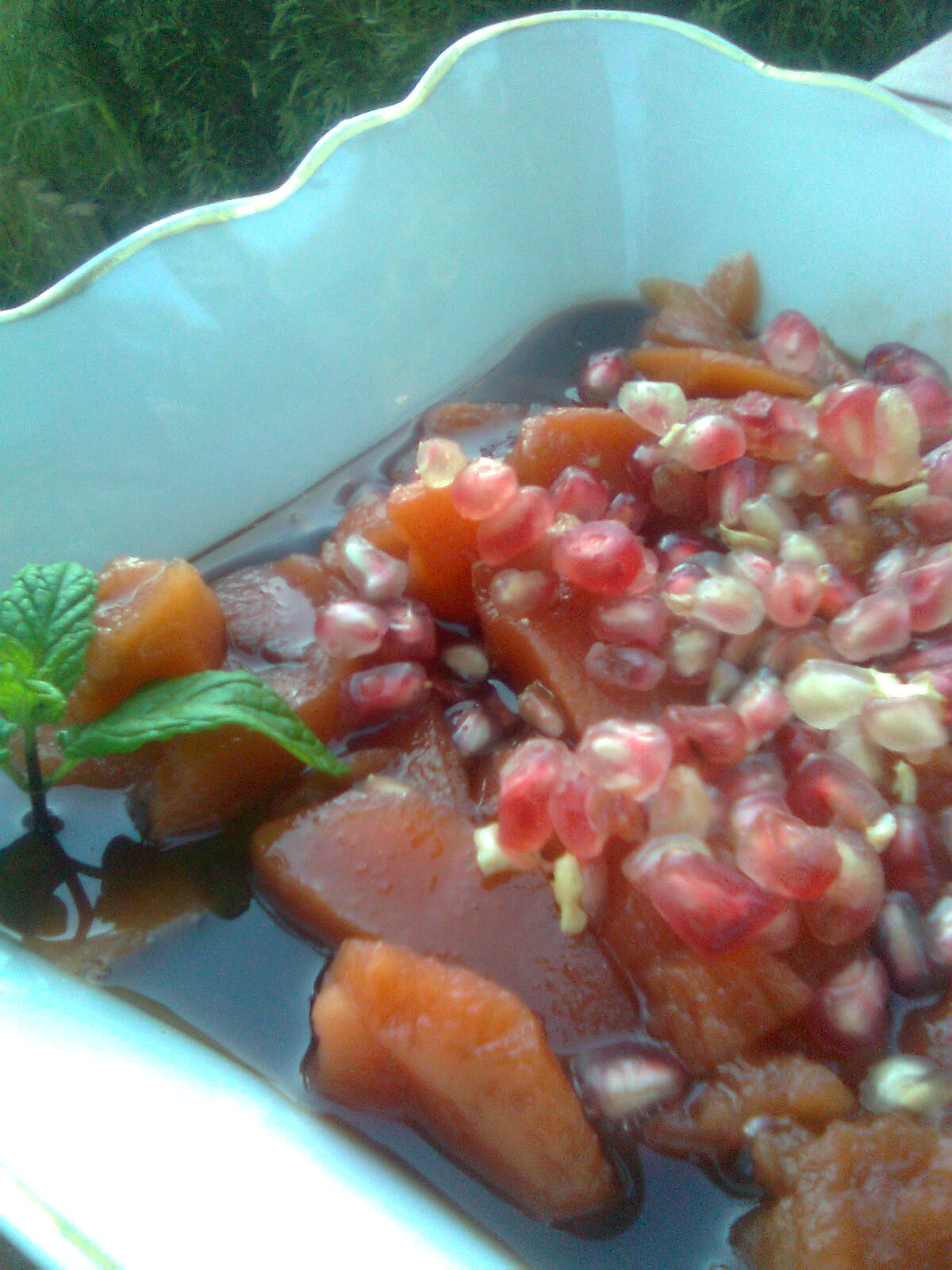 5- Coloca el membrillo escurrido de su agua de hervir en un recipiente bonito, lo riegas con la salsa de granada y le pones por encima los granos reservados.